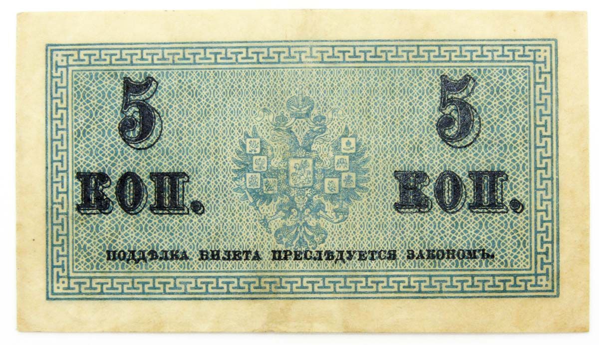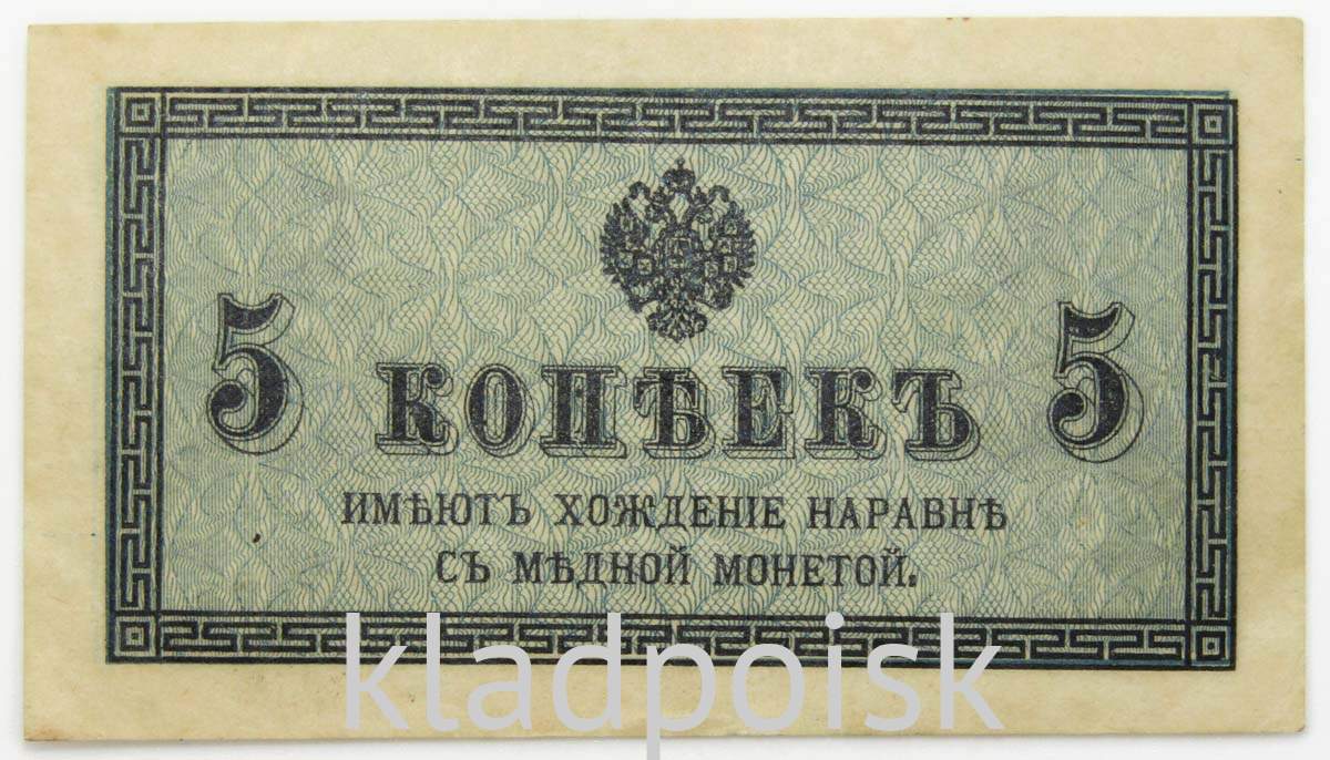 Казначейский разменный знак номиналом 5 копеек образца 1915 года. Размеры: 80 х 45 мм. В центре лицевой стороны находится государственный герб Российской Империи, чуть ниже номинал «5 копеек» и надпись «Имеют хождение наравне с медной монетой». По центру оборотной стороны также расположен государственный герб. По обеим сторонам от герба обозначение номинала «5 коп.», ниже предупреждение об ответственности за подделку.