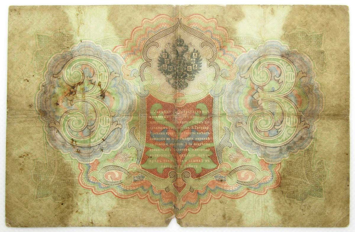Государственный кредитный билет 3 рубля 1905 года имеет светло зеленый стиль оформления. На лицевой стороне банкноты дважды отпечатана серия и номер банкноты. В центре надпись «Государственный кредитный билет 3 рубля». Чуть ниже располагается государственный герб и вензель Николая Второго. Внизу год «1905». Также сообщается информация о правилах обмена бумажных денег на металлические. На лицевой стороне содержатся подписи управляющего и кассира. На оборотной стороне в узорах изображен государственный герб, номинал цифрой «3» два раза и информация о «хождении бумажных денег наравне с металлическими».