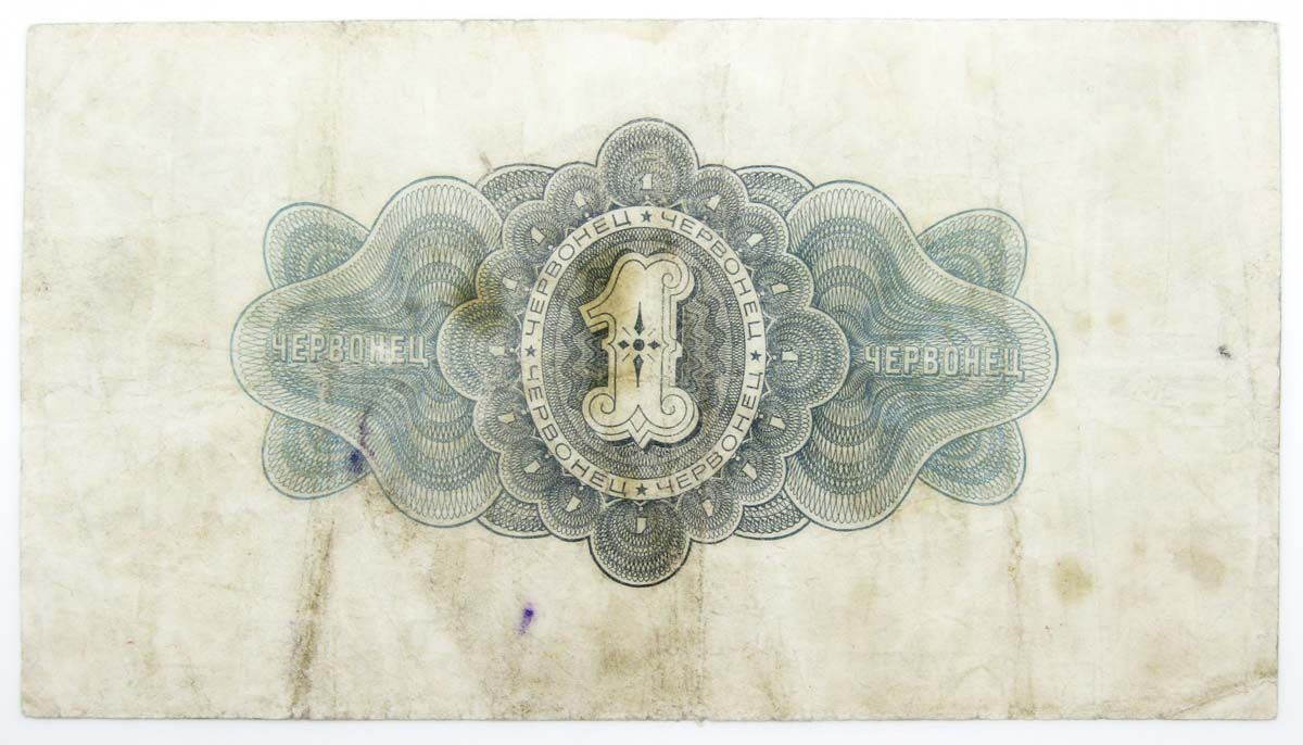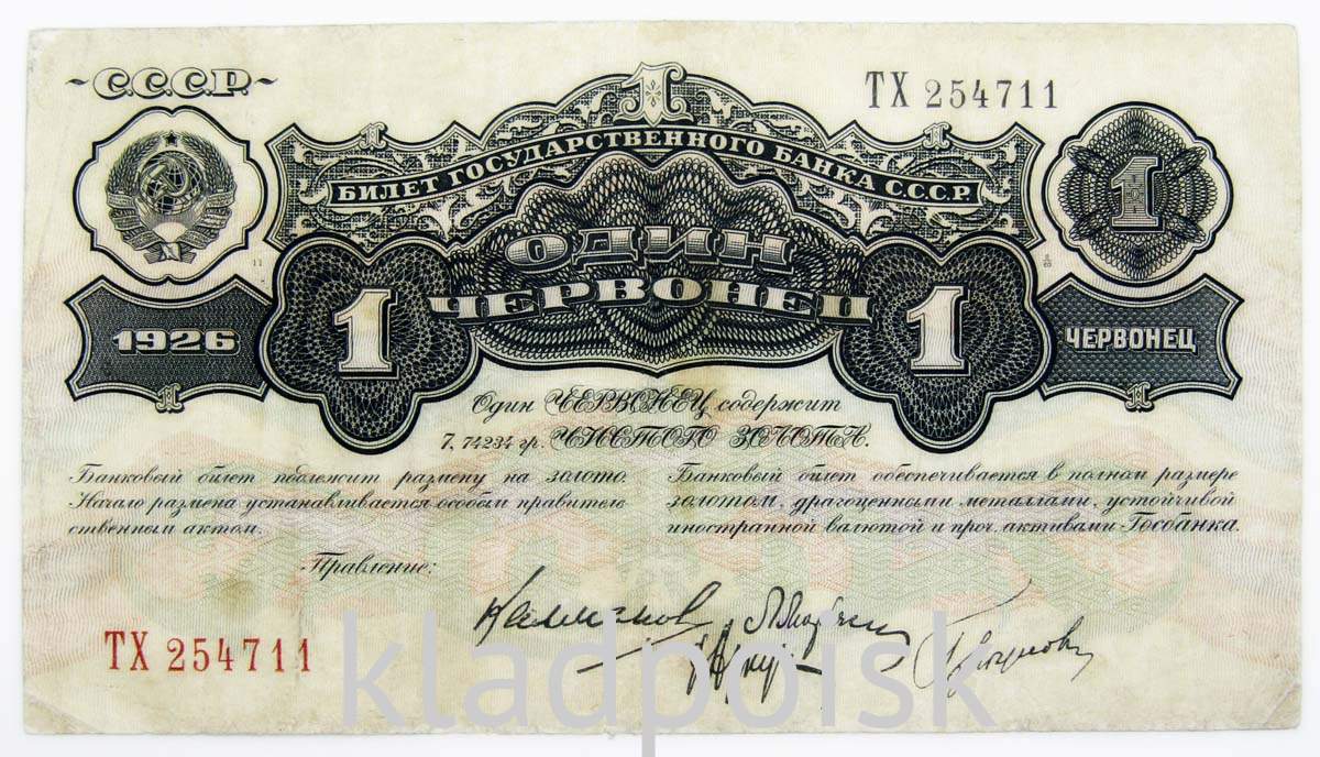 Лицевая сторона купюры 1 червонец 1926 года - Номинал цифрой и прописью на русском языке, герб и название государства, год выпуска, подписи членов правления Госбанка, пояснительные надписи.