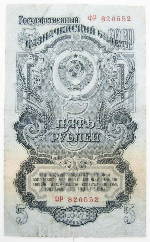 Лицевая сторона: изображен герб СССР, надпись «Государственный казначейский билет три рубля», в центре большая цифра «5». Внизу указан год выпуска «1947», номинал на языках союзных республик, дважды указаны серия и номер.