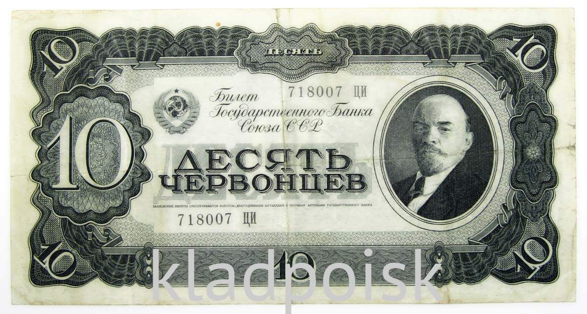 Лицевая сторона купюры 10 червонцев 1937 года - Номинал цифрами и прописью на русском языке, герб СССР, пояснительная "Билет Государственного Банка Союза ССР. Десять червонцев. Банковские билеты обеспечиваются золотом, драгоценными металлами и прочими активами государственного банка.", портрет Ленина.