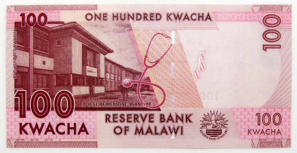 Оборотная сторона: Медицинский колледж в Блантайре. Стетоскоп. Логотип Резервного банка Малави.