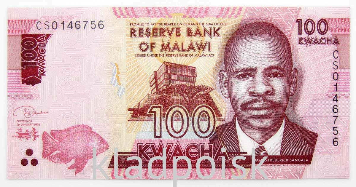 Лицевая сторона: Портрет Джеймса Сангалы (1900 - 1974). Здание в заповедникае Банкоф Малави в Лилонгве. Цихлид Ливингстона (Nimbochromis livingstonii).