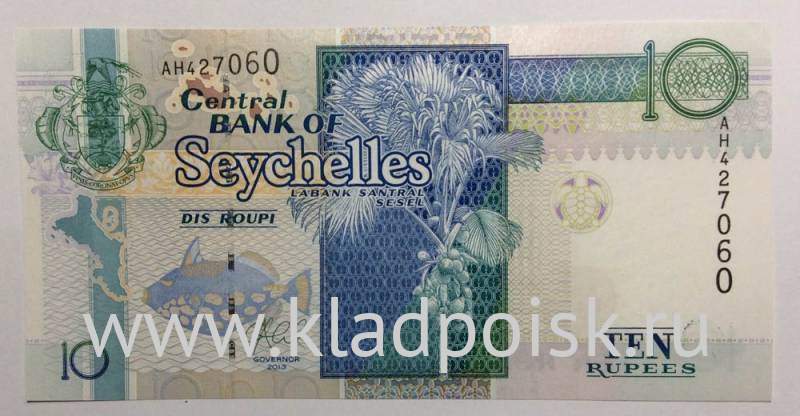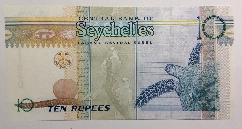 Лицевая сторона: Сейшельская пальма (Coco-de-Merpalm). Синеперый балистод (рыба триггер). Герб Сейшельских Островов.