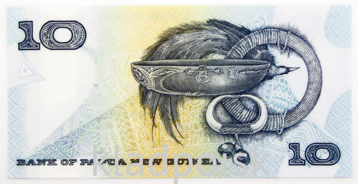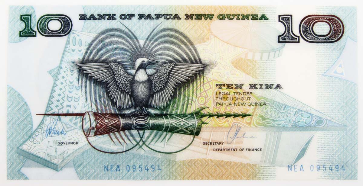 Лицевая сторона: Герб Папуа — Новой Гвинеи (изображение райской птицы, сидящей на кунду (новогвинейском барабане) и церемониальном копье).