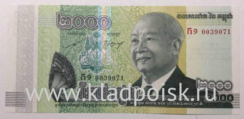 Лицевая сторона: в правой части банкноты портрет Нородома Сианука - предыдущего короля Камбоджи. Слева от портрета - герб страны. Над гербом - номинал 2000 риелей на кхмерском языке и подписи уполномоченных лиц. Под гербом - серийный номер банкноты. Слева от серийного номера - голова наги. Серийный номер также находится справа от портрета короля. Номинал цифрами обозначен в нижнем правом углу банкноты.