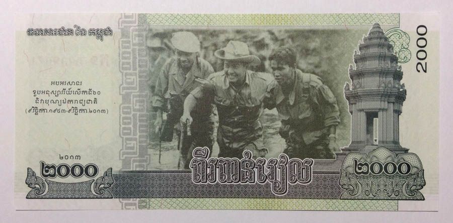 Оборотная сторона: В центре банкноты - изображение Нородома Сианука, который проводит солдат через реку. В левой части банкноты - Монумент Независимости в Пномпене. Номинал проставлен в верхнем правом и нижних левом и правом углах банкноты.