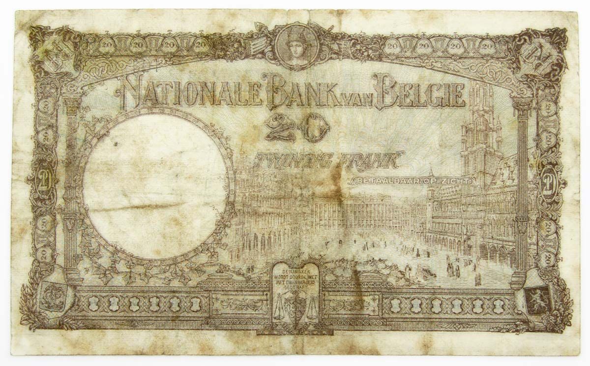 - Оборотная сторона: NATIONAL BANK VAN BELGIE 20 TWINTIG FRANK BETAALBAAR OP ZICHT THESAURIE DE NAMAKER WORDT DOOR DE WET MET DWANGARBEID GESTRAFT. Брюссельская площадь.