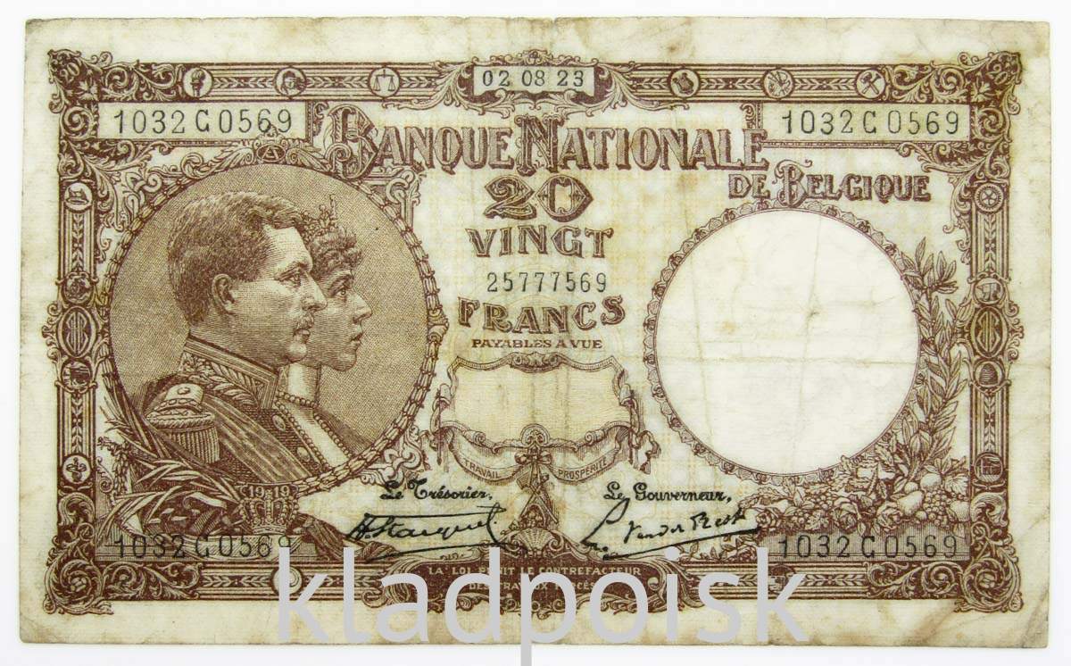 - Лицевая сторона: BANQUE NATIONALE DE BELGIQUE 20 VINGT FRANCS PAYABLES VUE TRSORERIE LA LOI PUNIT LE CONTREFACTEUR DES TRAVAUX FORCS. Слева портреты короля Альберта и королевы Елизаветы. В центре номинал
