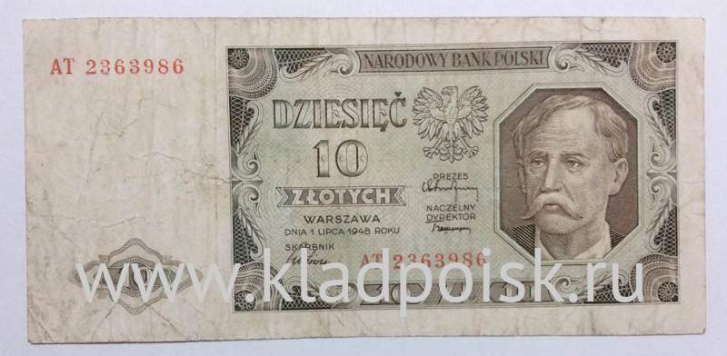 Лицевая сторона: 3/4 правой стороны поля банкноты покрыто орнаментом, в четырех углах поля банкноты узорные виньетки. В верхней части банкноты надпись: NARODOWY BANK POLSKI. В левой части поля банкноты – номинал в три строки: DZIESIĘĆ 10 ZŁOTYCH, слово ZŁOTYCH помещено в горизонтальную полосу, орнаментированную по краям. Слева – герб страны. Под номиналом прописью в две строки дата и место эмиссии: WARSAWA DNIA 1 LIPCA 1948 ROKU, справа и ниже три подписи – президента, главного директора и казначея Польского банка, внизу, в центре поля банкноты – семизначный серийный номер. В правой части поля банкноты в восьмиугольной рамке портрет крестьянина. В нижней части поля банкноты номинал в одну строку: 10 ZŁ 10. В левом верхнем углу аллонжа семизначный серийный номер, в левом нижнем углу аллонжа помещен номинал цифрой 10 в ромбовидной виньетке.
