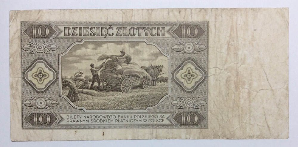 Оборотная сторона: 3/4 левой стороны поля банкноты покрыто орнаментом, в четырех углах поля банкноты номинал цифрой 10 в шестиугольной рамке. В верхней части банкноты на горизонтальной ленте надпись: DZIESIĘĆ ZŁOTYCH, в нижней в три строки сообщается о том, что билеты Польского банка являются единственным платежным средством в стране. В центре – прямоугольник с изображением погрузки снопов на воз, по краям – орнамент.