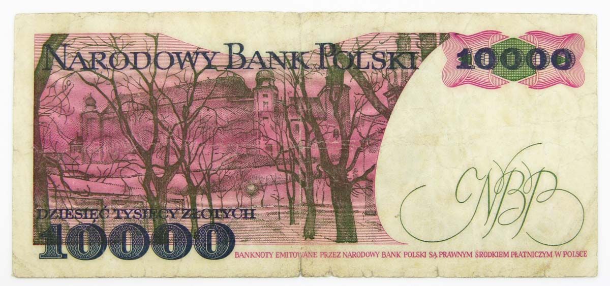 Оборотная сторона: изображены стволы деревьев без листьев. Сверху банкноты надпись «NARODOWY BANK POLSKI». Слева внизу номинал числом «10000», выше обозначение номинала прописью «dziesiec tysiecy zlotych». На правой стороне банкноты в верхней части число «10000». В нижнем правом углу аббревиатура «NBP».