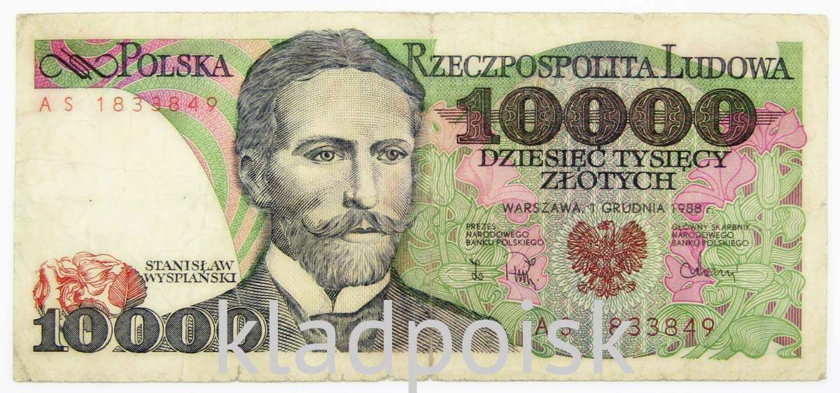 Лицевая сторона: портрет Станислава Выспяньского (Stanisław Wyspiański). Сверху банкноты надпись «Polska Rzeczpolita Ludowa». Ниже этой надписи крупным шрифтом написан номинал купюры числом «10000» и прописью «dziesiec tysiecy zlotych». Под ними герб Польши. Слева внизу номинал числом «10000».