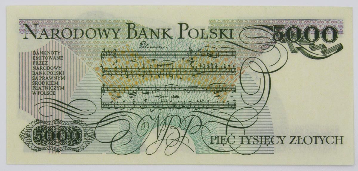 Оборотная сторона: основное изображение занимают ноты Полонеза. Сверху банкноты надпись «NARODOWY BANK POLSKI». Слева внизу номинал числом «5000», справа обозначение номинала прописью «piec tysiacy zlotych». На правой стороне банкноты в верхней части число «2000». В нижнем правом углу аббревиатура «NBP».