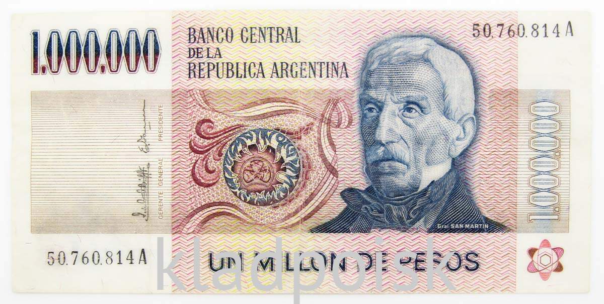 На лицевой стороне банкноты 1000000 песо Аргентины изображен портрет национального героя, одного из руководителей войны за независимость испанских колоний в Латинской Америке 1810-1826 гг. – генерала Хосе де Сан-Мартина (1778-1850).