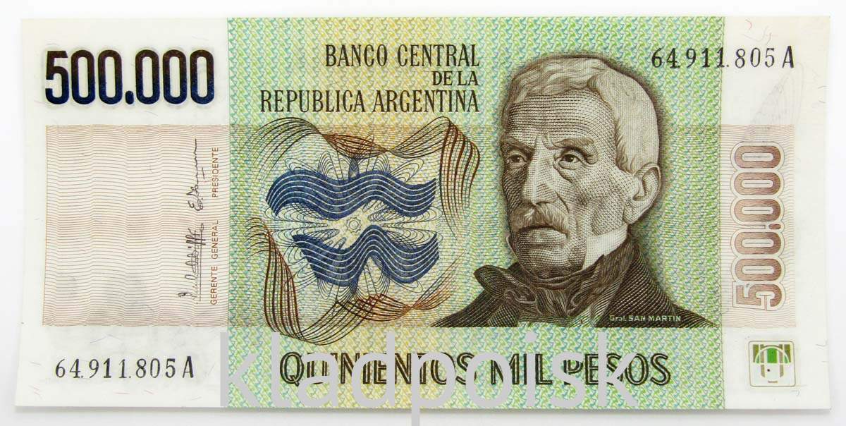 На лицевой стороне банкноты 500 000 песо Аргентины изображен портрет национального героя, одного из руководителей войны за независимость испанских колоний в Латинской Америке 1810-1826 гг. – генерала Хосе де Сан-Мартина (1778-1850).