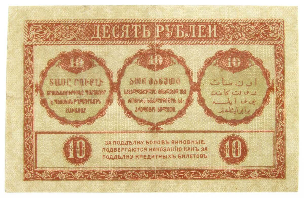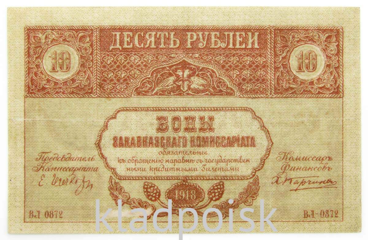 На лицевой стороне: Обозначение номинала. Надписи: Десять рублей. 10. Боны Закавказскаго комиссарiата обязательны къ обращенiю наравне съ государственными кредитными билетами. Председатель комиссариата. Комиссаръ Финансовъ. 1918