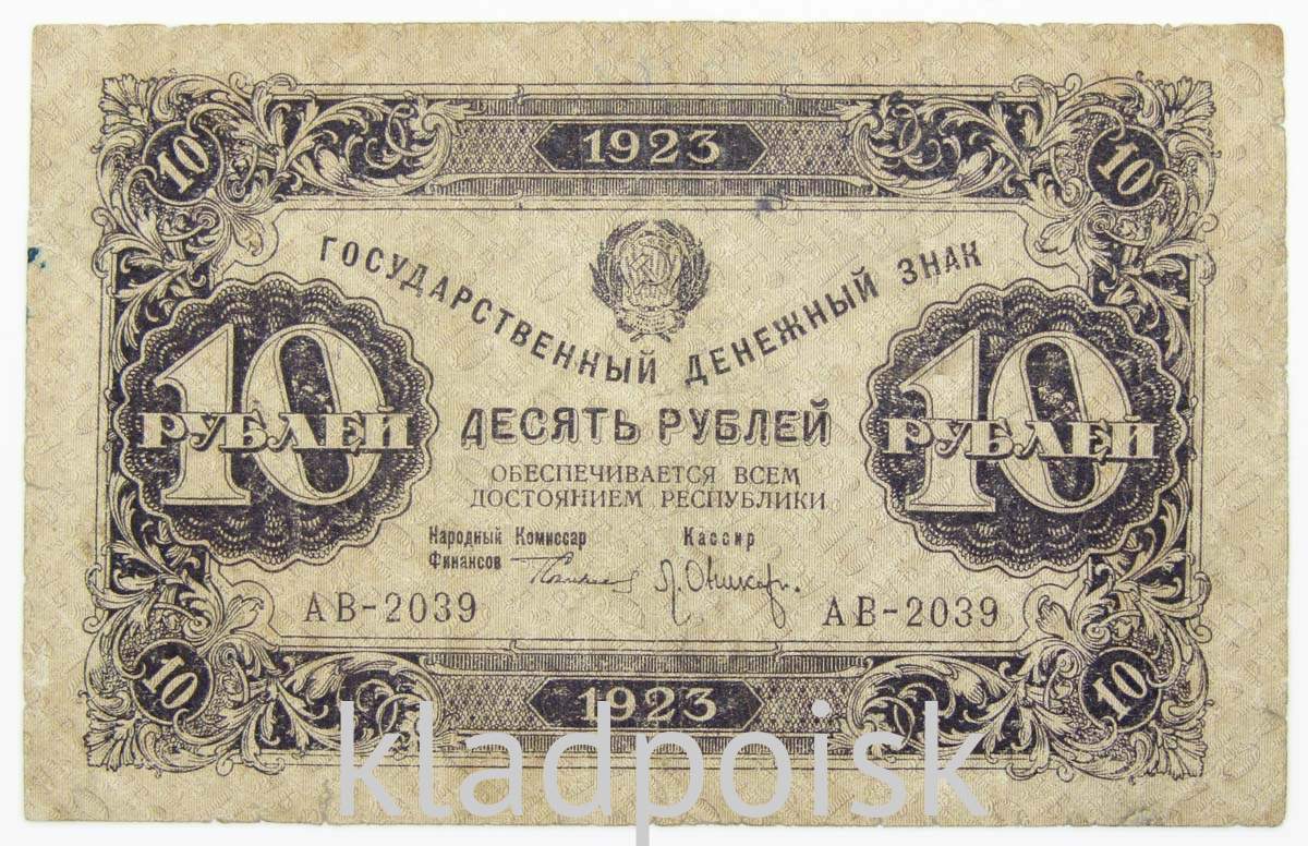 Лицевая сторона купюры 10 рублей 1923 года - гильоширные розетки с цифрой «10», поверх надпись «рублей». Также имеется герб РСФСР и несколько надписей, таких как «Государственный денежный знак», «ДЕСЯТЬ РУБЛЕЙ».