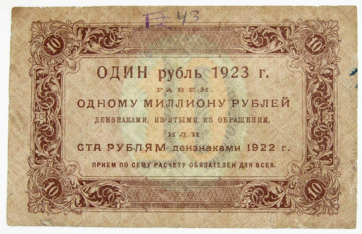 Оборотная сторона - на фоне цифры «10» и надпись «Один рубль 1923 г. равен одному миллиону рублей дензнаками, изъятыми из обращения, или ста рублям дензнаками 1922 г.».