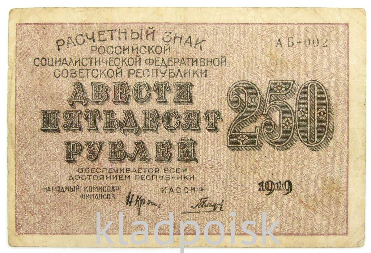 Лицевая сторона купюры 250 рублей 1919 года - Номинал цифрами и прописью, подписи Народного комиссара финансов и кассира, пояснительная надпись, год выпуска. "Расчетный знак Российской Социалистической Федеративной Советской Республики. 250 двести пятьдесят рублей. Обеспечивается всем достоянием республики."