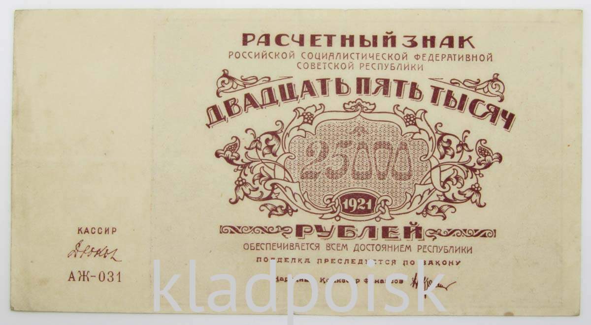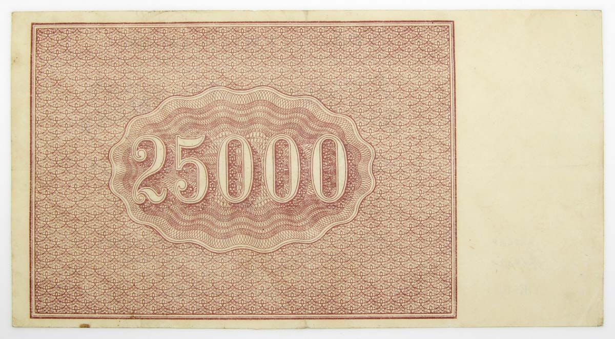 Оборотная сторона содержит рамку, закрашенную внутри фоном, состоящим из мелких узоров. Посередине находится большая гильоширная розетка с числом "25000".