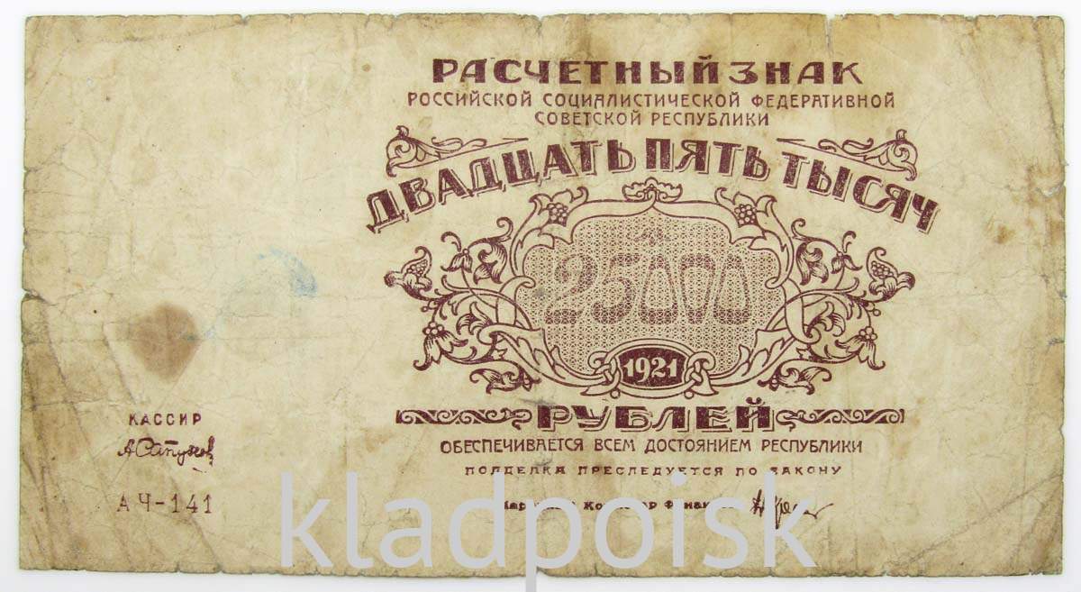 Оборотная сторона содержит рамку, закрашенную внутри фоном, состоящим из мелких узоров. Посередине находится большая гильоширная розетка с числом "25000".