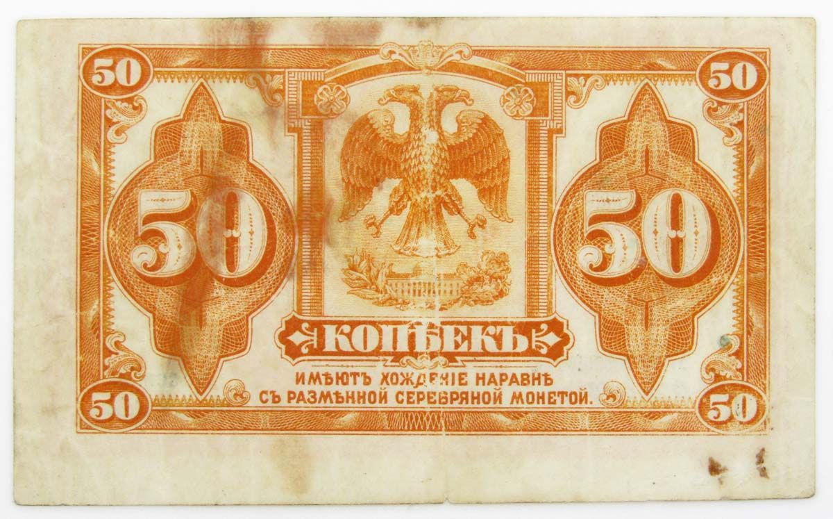 Реверс: Гильоши с номиналом. Текст: 50 КОПѢЕКЪ ПОДДѢЛКА БИЛЕТА ПРЕСЛѢДУЕТСЯ ЗАКОНОМЪ.