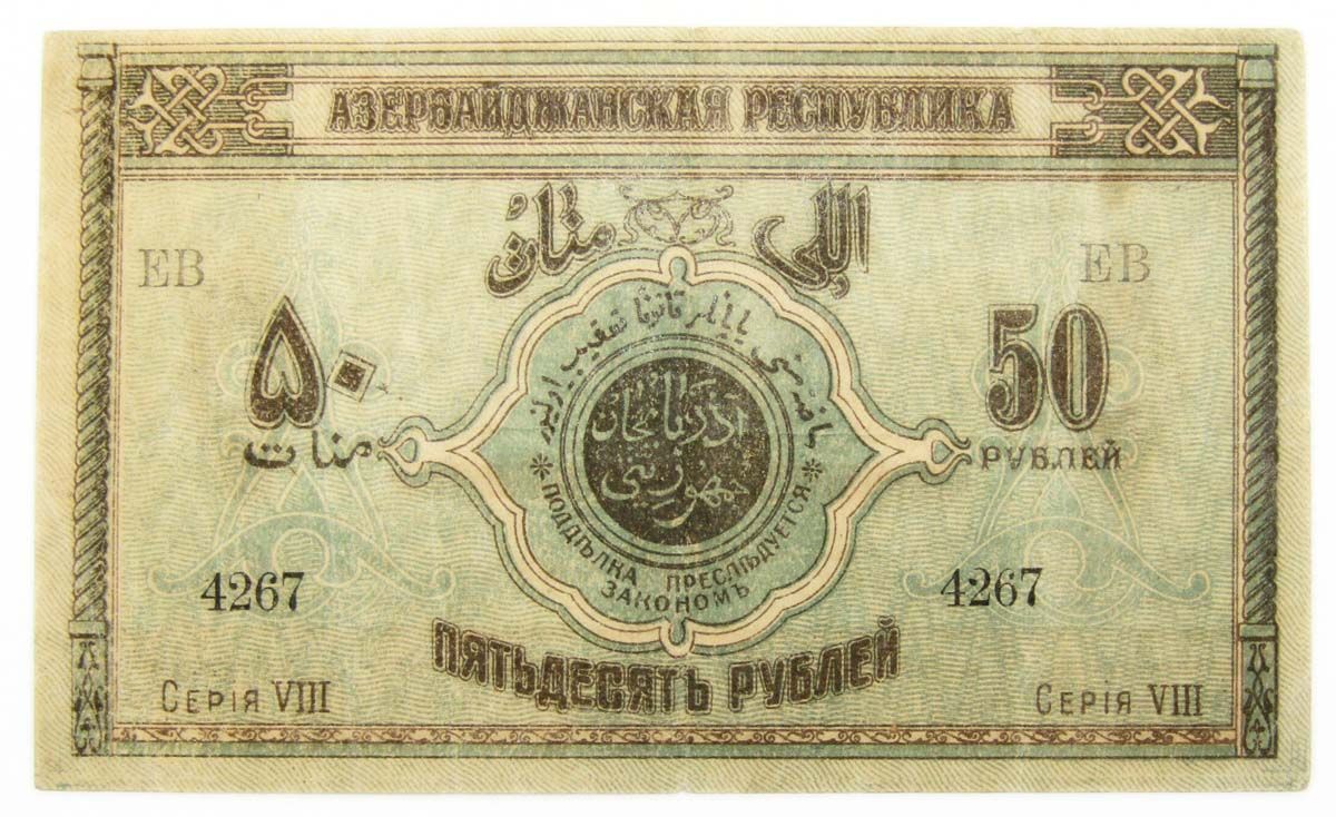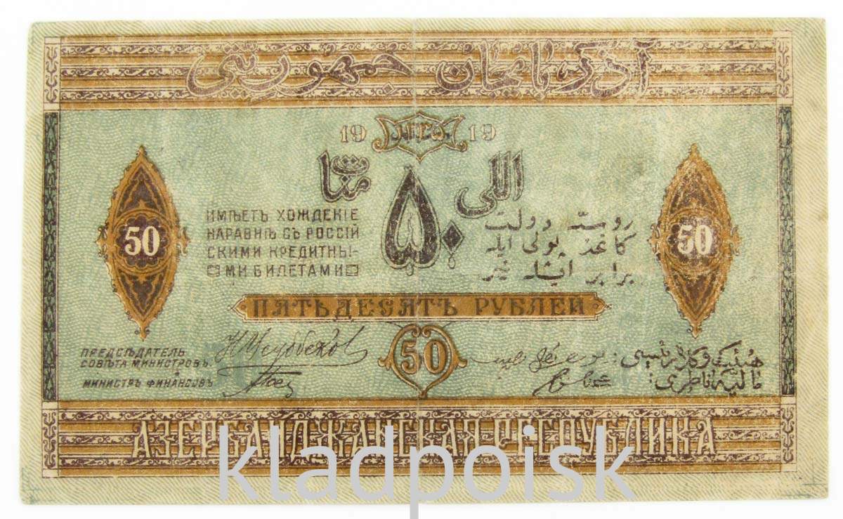 Банкнота 50 рублей 1919 Азербайджанская республика, основные цвета: желтый, коричнневый.