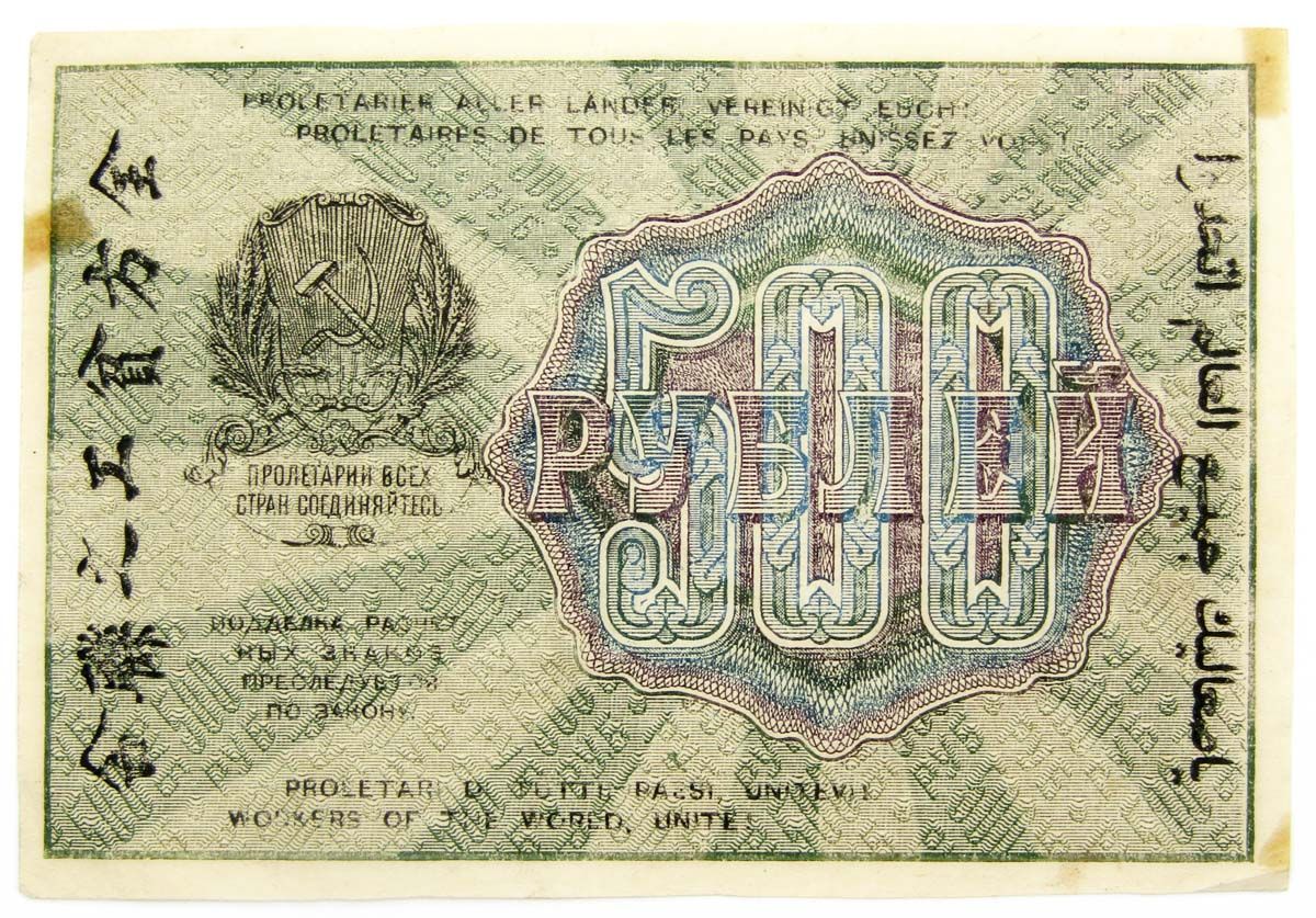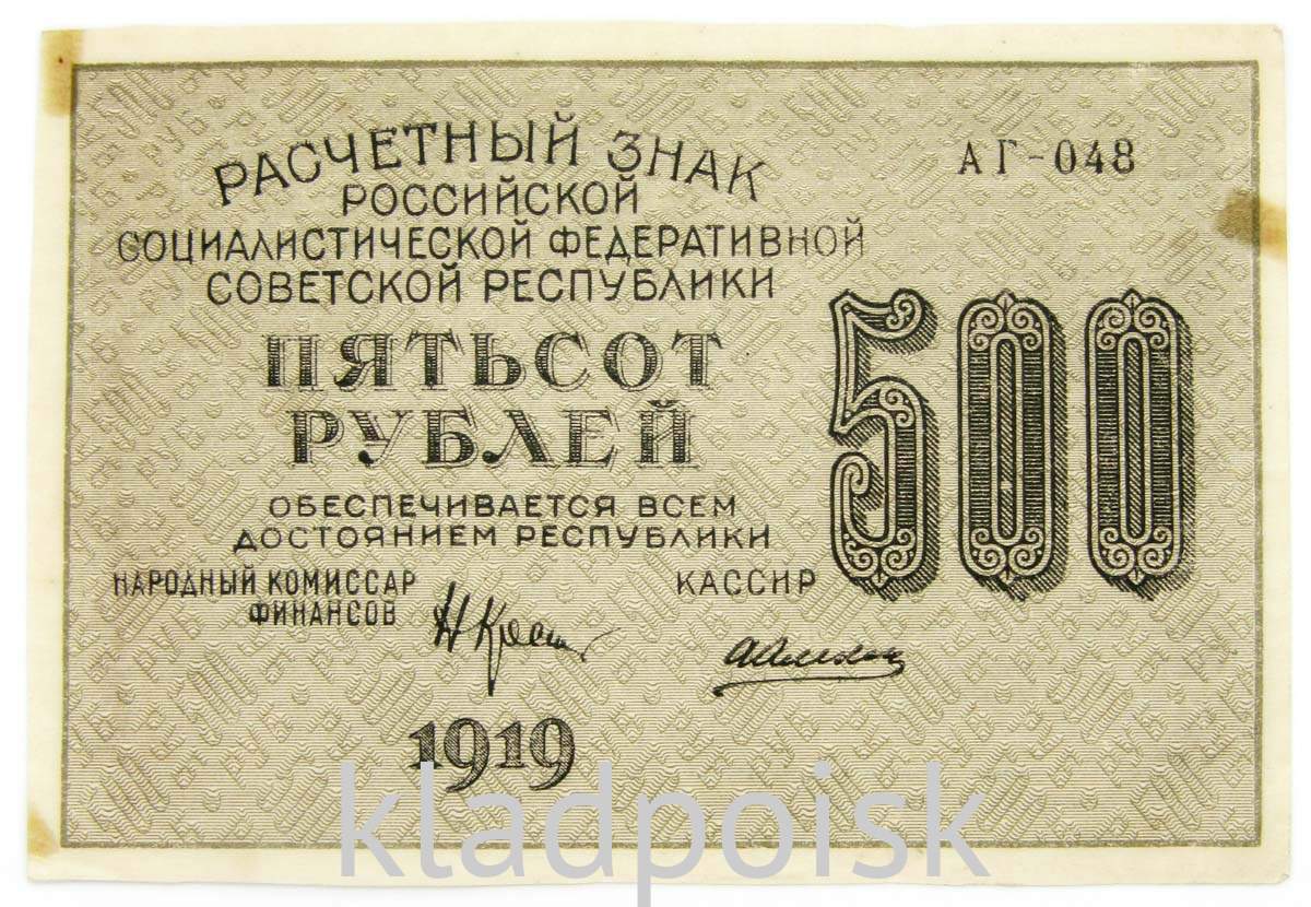 Банкнота 500 рублей 1919 РСФСР, основные цвета: черный, оливковый.