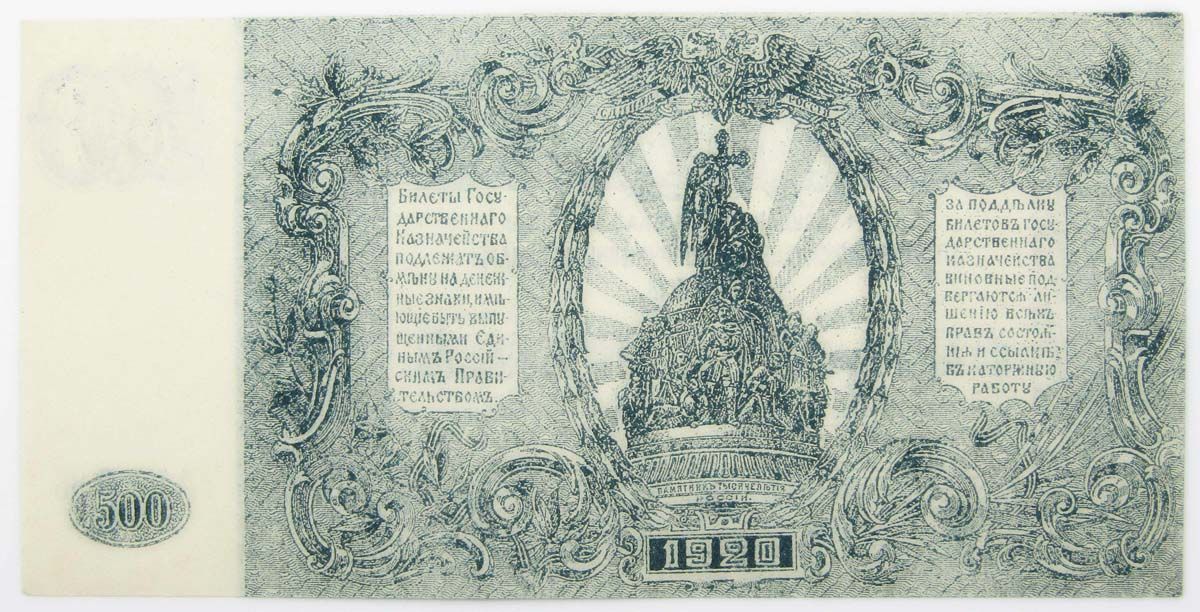 На лицевой стороне: Двуглавый орел, номинал, серия и подписи. Легенда: Билетъ Государственнаго Казначейства Главнаго Командованiя Вооруженными Силами на Юге Россiи. Пятьсотъ Рублей. Обязателенъ къ приему во всехъ платежахъ въ казну и между частными лицами.