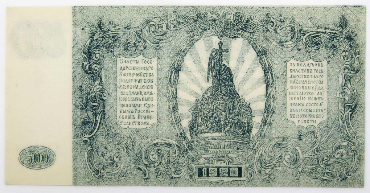 На лицевой стороне: Двуглавый орел, номинал, серия и подписи. Легенда: Билетъ Государственнаго Казначейства Главнаго Командованiя Вооруженными Силами на Юге Россiи. Пятьсотъ Рублей. Обязателенъ къ приему во всехъ платежахъ въ казну и между частными лицами.