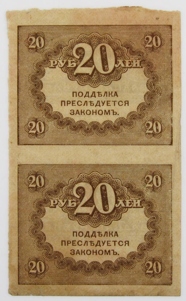 Казначейский знак 20 рублей 1917 года. Размер знака 55х43 мм, цвет оформления – коричневый. На лицевой стороне изображен двухглавый орел с опущенными крыльями, но без атрибутики монархии. Надпись «казначейский знак 20 руб», внизу «обязателен к обращению наравне с кредитными билетами». На оборотной стороне обозначения номинала цифрой и надпись «подделка преследуется по закону».