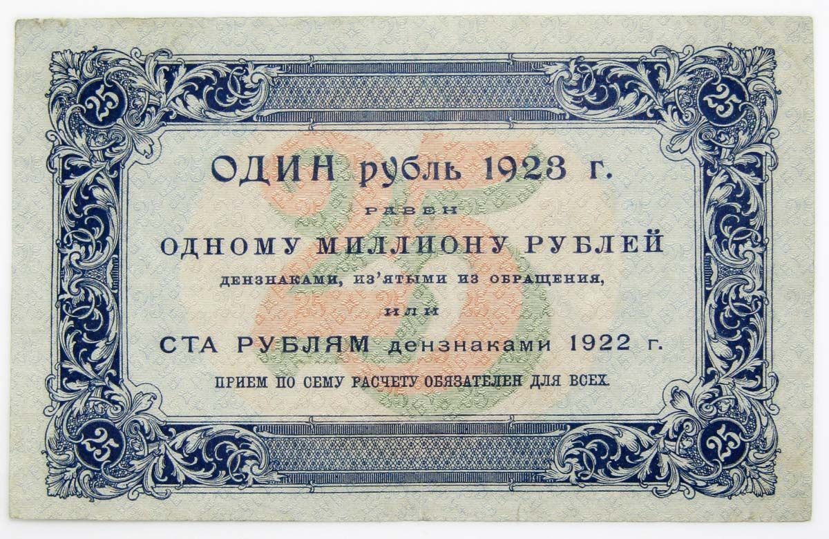 Реверс: на фоне цифры «25» помещен текст «Денежные знаки 1923 года обязательны к приему для всех согласно расчету, установленному в отношении денежных знаков прежних образцов декретом от 24 октября 1922 года.». В гильоширных розетках цифра «25».