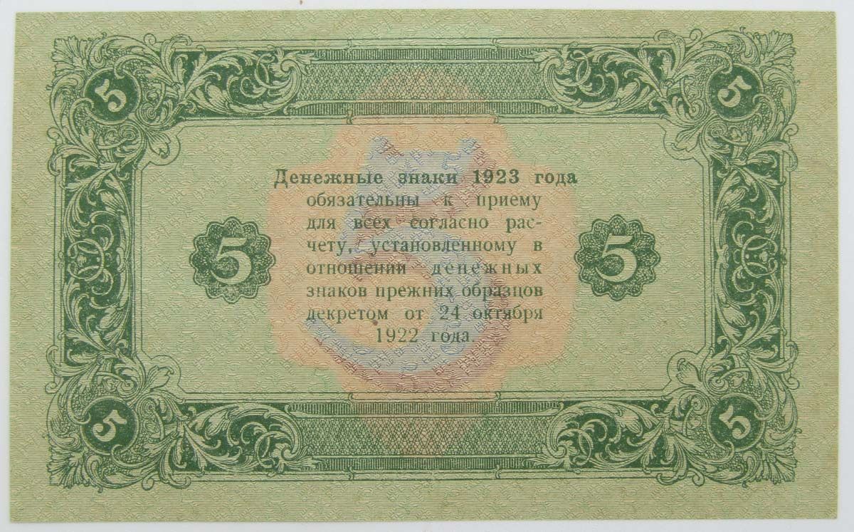 Реверс: на фоне цифры «5» помещен текст «Один рубль 1923 г. равен одному миллиону рублей дензнаками, изъятыми из обращения, или ста рублям дензнаками 1922 г.». В гильоширных розетках цифра «5».