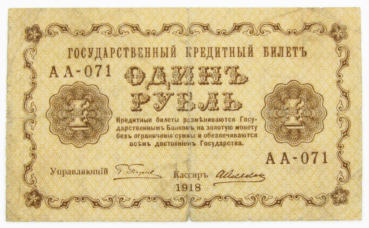 Банкнота 1 рубль1918 года печаталась Народным банком РСФСР до 1922 года.