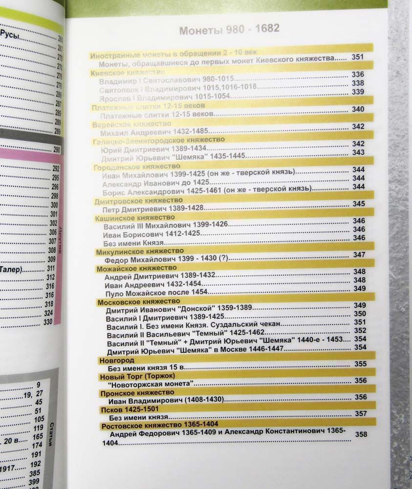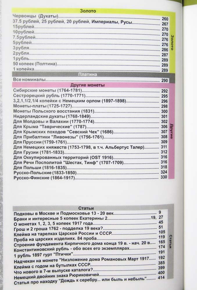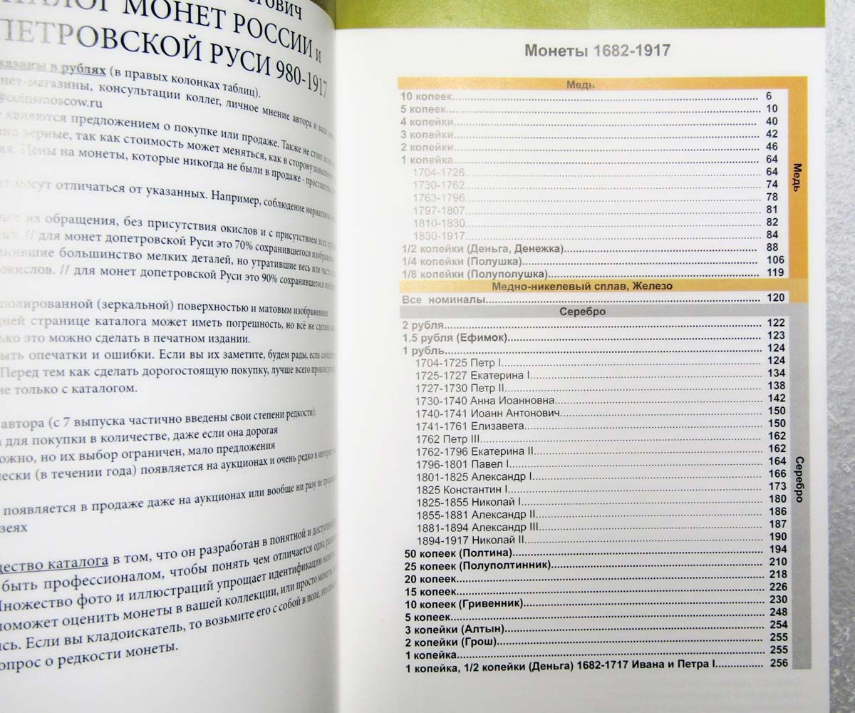В каталог вошли: инициалы минцмейстеров, обозначения монетных дворов, обозначения дат славянскими буквами на монетах Петра, разновидности гуртов, разновидности узорных гуртов, общегосударственные выпуски, памятные и подарочные монеты, специальные выпуски, региональные выпуски, самые редкие и дорогие монеты России.