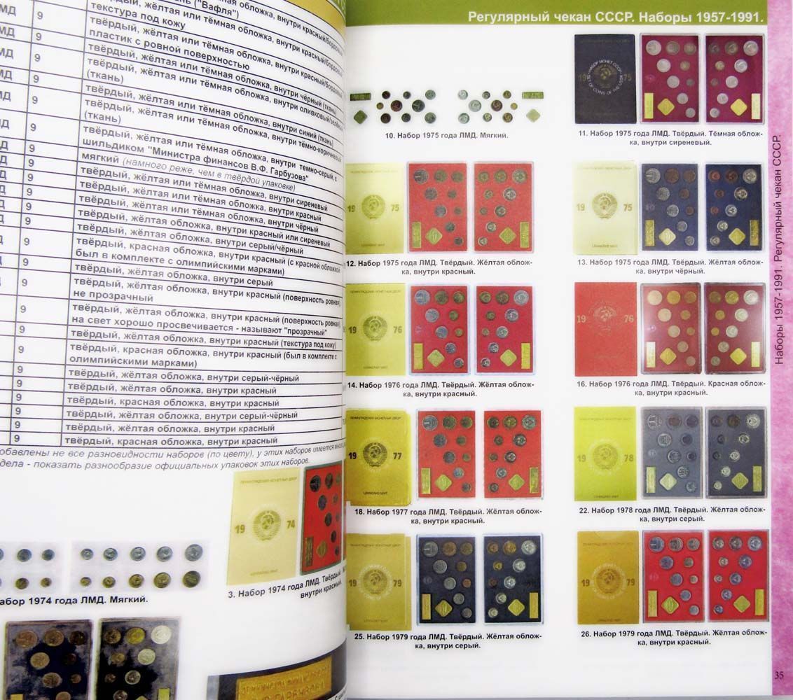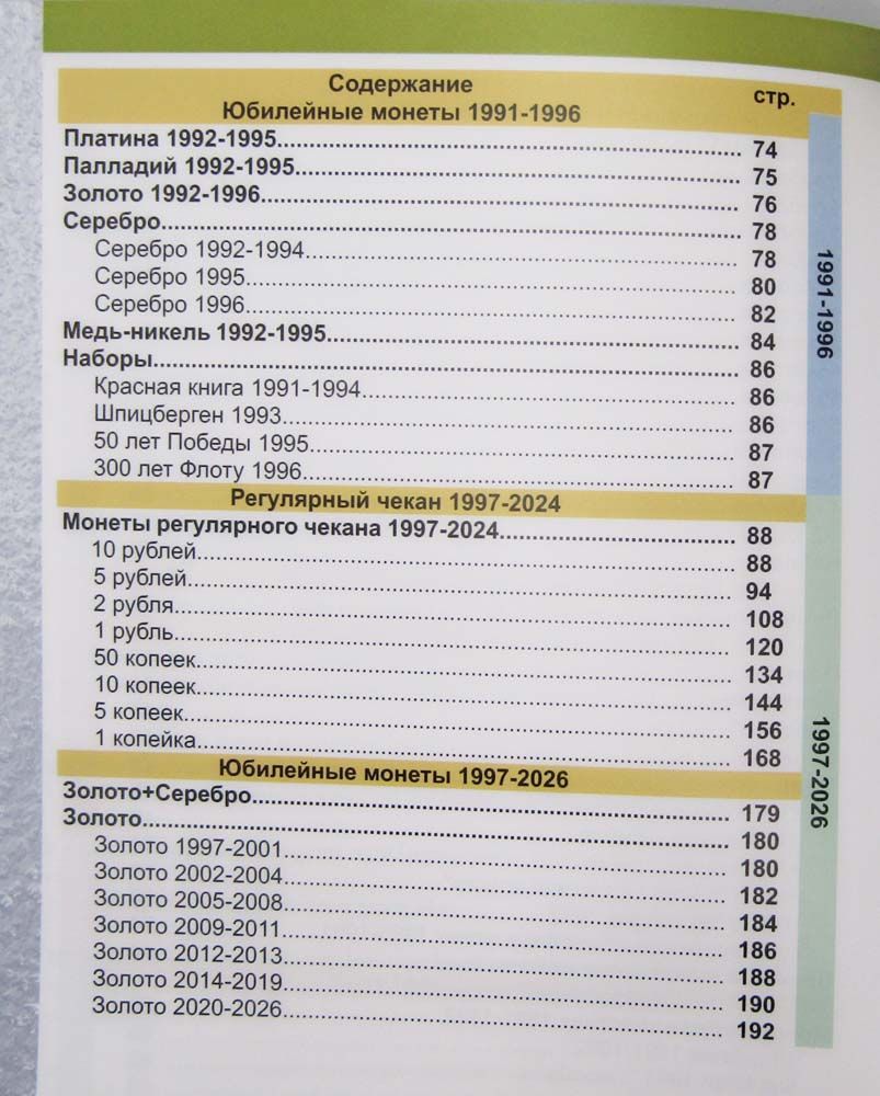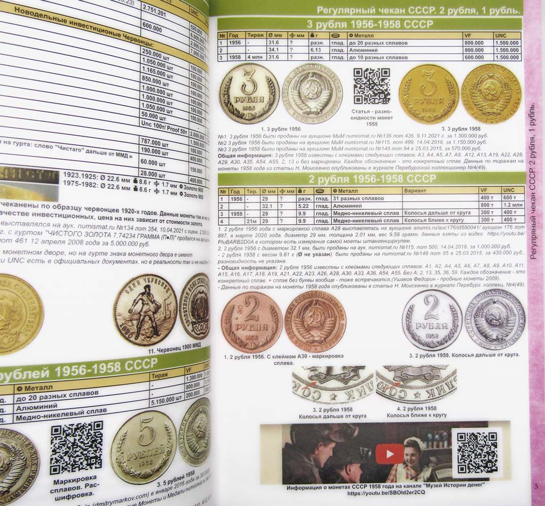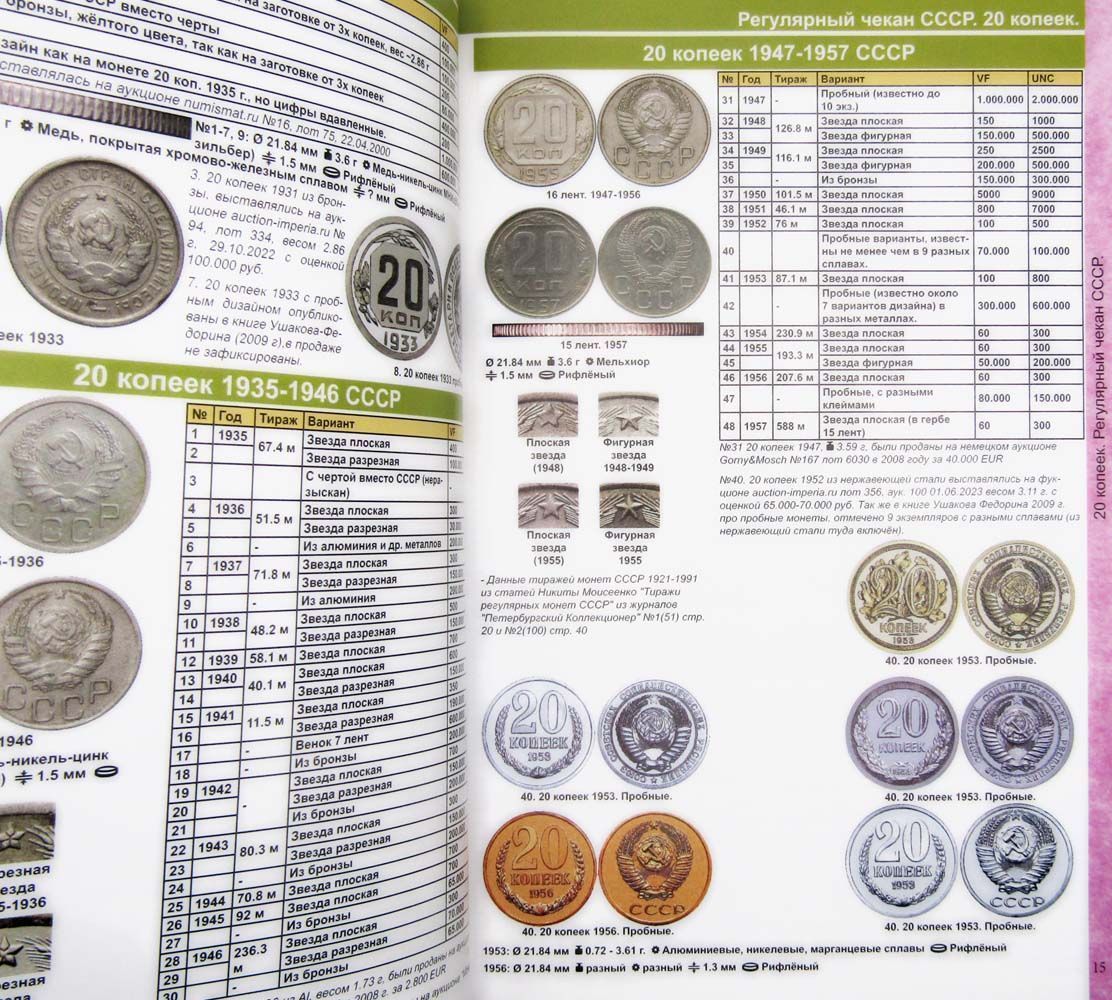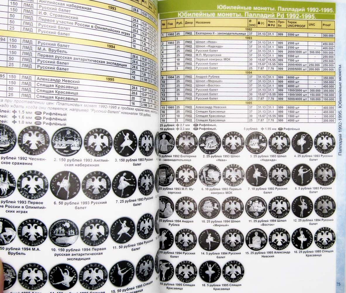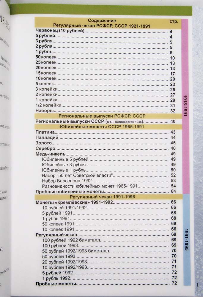 Дает информацию по монетным дворам, разновидностям, тиражам, пробе и весу монет. Содержит рыночные цены, имеется раздел по бракованным монетам.