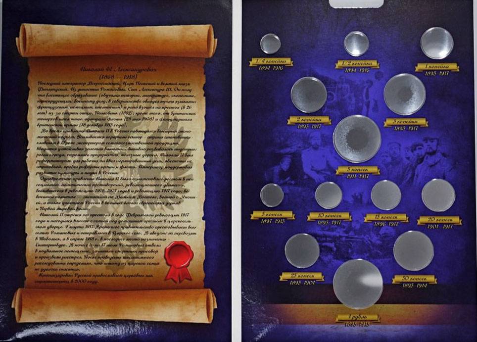 Номиналы: 1/4 копейки , 1/2 копейки , 1 копейка , 2 копейки, 3 копейки, 5 копеек , 10 копеек , 15 копеек , 20 копеек , 25 копеек , 50 копеек , 1 рубль.