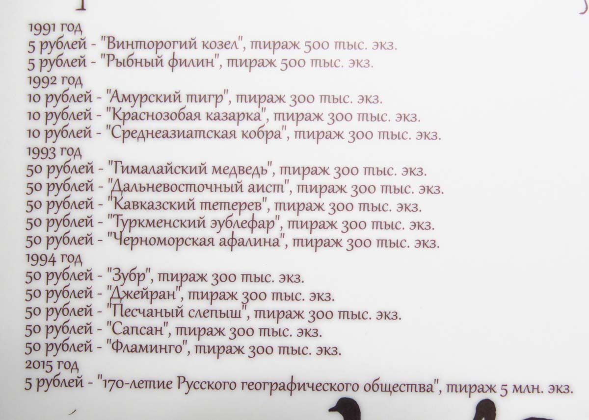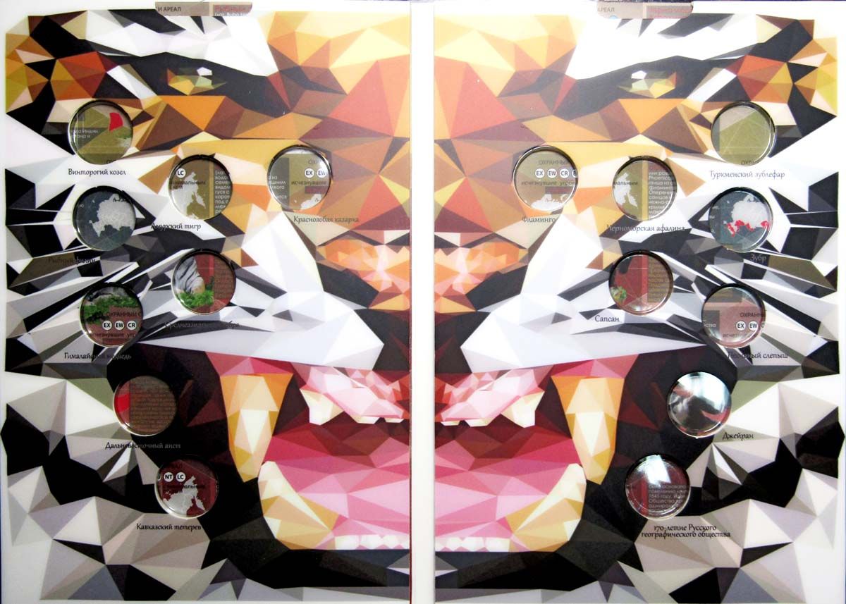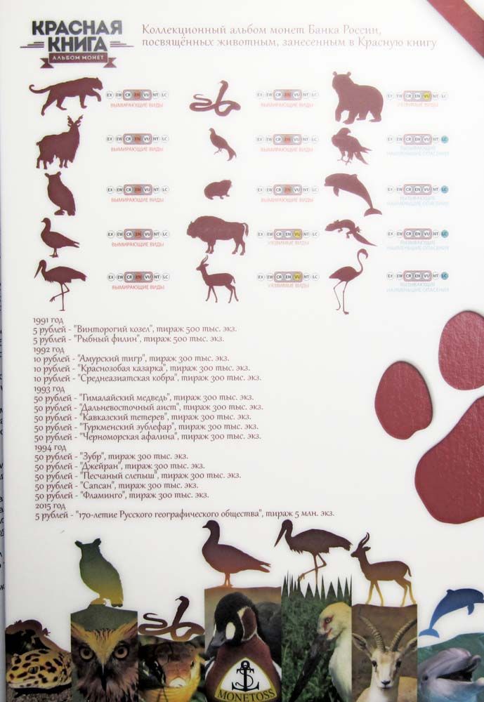 Альбом-планшет для монет серии «Красная книга» 1991-1994 гг. и юбилейной монеты «170-летие Русского Географического Общества» 2015г. Каждая ячейка в альбоме подписана.