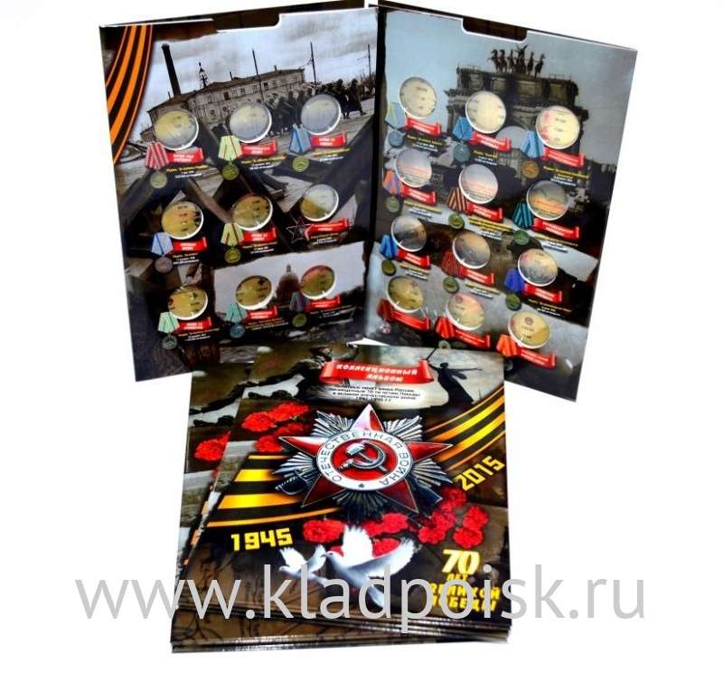 Альбом для монет «70 лет Победы» рассчитан на 21 монету - 18 монет номиналом 5 рублей и 3 монеты 10 рублей, посвященных 70-летию Победы в Великой Отечественной войне: