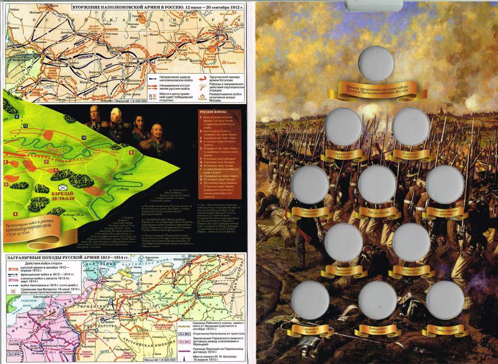 Альбом предназначен для хранения 2-х рублевых, 5-ти рублевых и 10-и рублевых монет 2012г, посвященных 200-летию победы в Отечественной войне 1812г.