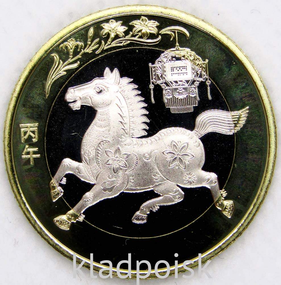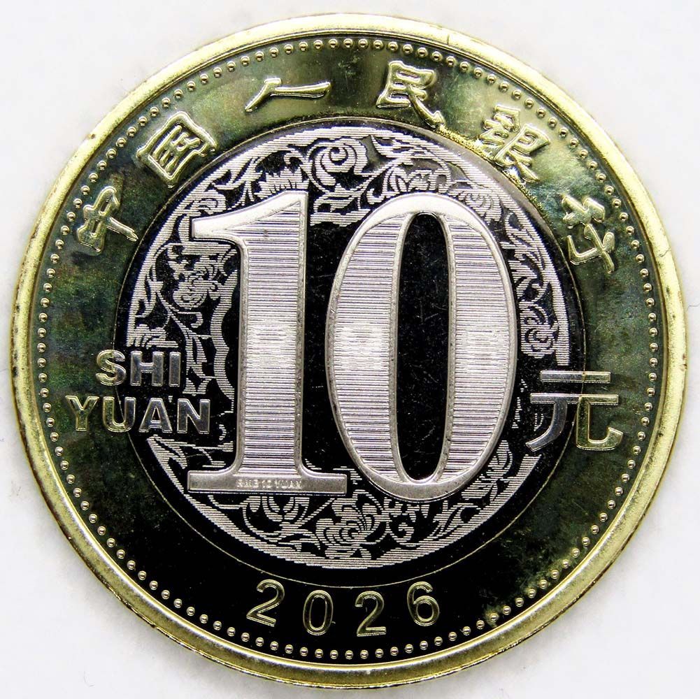 На реверсе монеты 10 юаней Китая Год Лошади 2026 изображен знак лунного календаря – Лошадь.