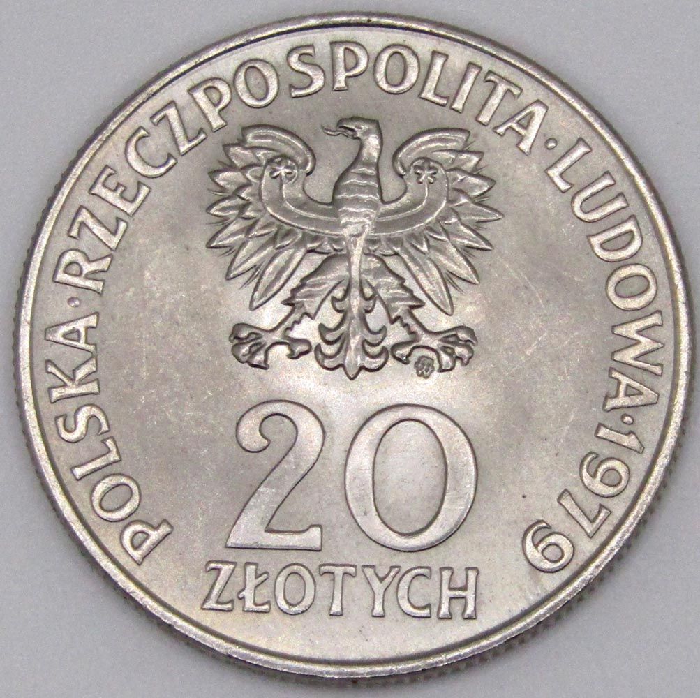 Аверс: герб Польши, номинал монеты «20 zł», надпись «POLSKA RZECZPOSPOLITA LUDOWA» и дата 1979.