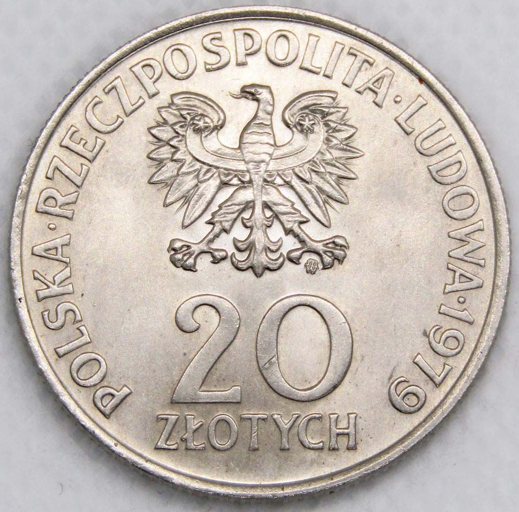 Аверс: герб Польши, номинал монеты «20 zł», надпись «POLSKA RZECZPOSPOLITA LUDOWA» и дата 1979.