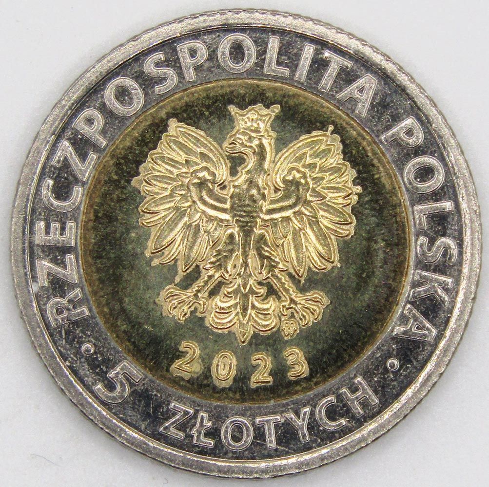 Аверс: В центре – герб страны: коронованный польский орёл, возле правой ноги орла – знак монетного двора, под орлом – год выпуска. Круговая надпись сверху: RZECZPOSPOLITA POLSKA; круговая надпись снизу, указывающая номинал: 5 ZLOTYCH.
