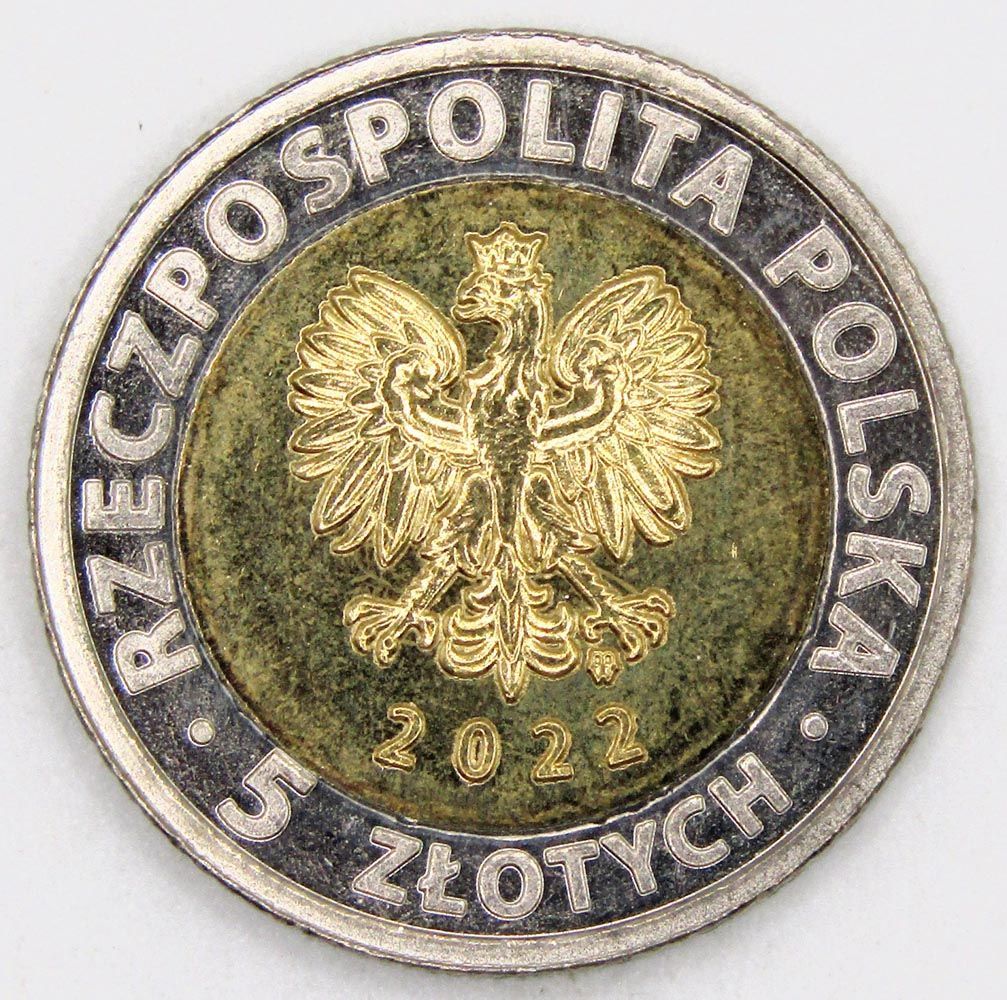 Аверс: В центре – герб страны: коронованный польский орёл, возле правой ноги орла – знак монетного двора, под орлом – год выпуска. Круговая надпись сверху: RZECZPOSPOLITA POLSKA; круговая надпись снизу, указывающая номинал: 5 ZLOTYCH.