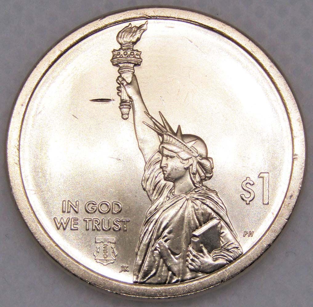 Аверс: изображение Статуи Свободы в профиль с надписями «IN GOD WE TRUST» и «1 доллар».