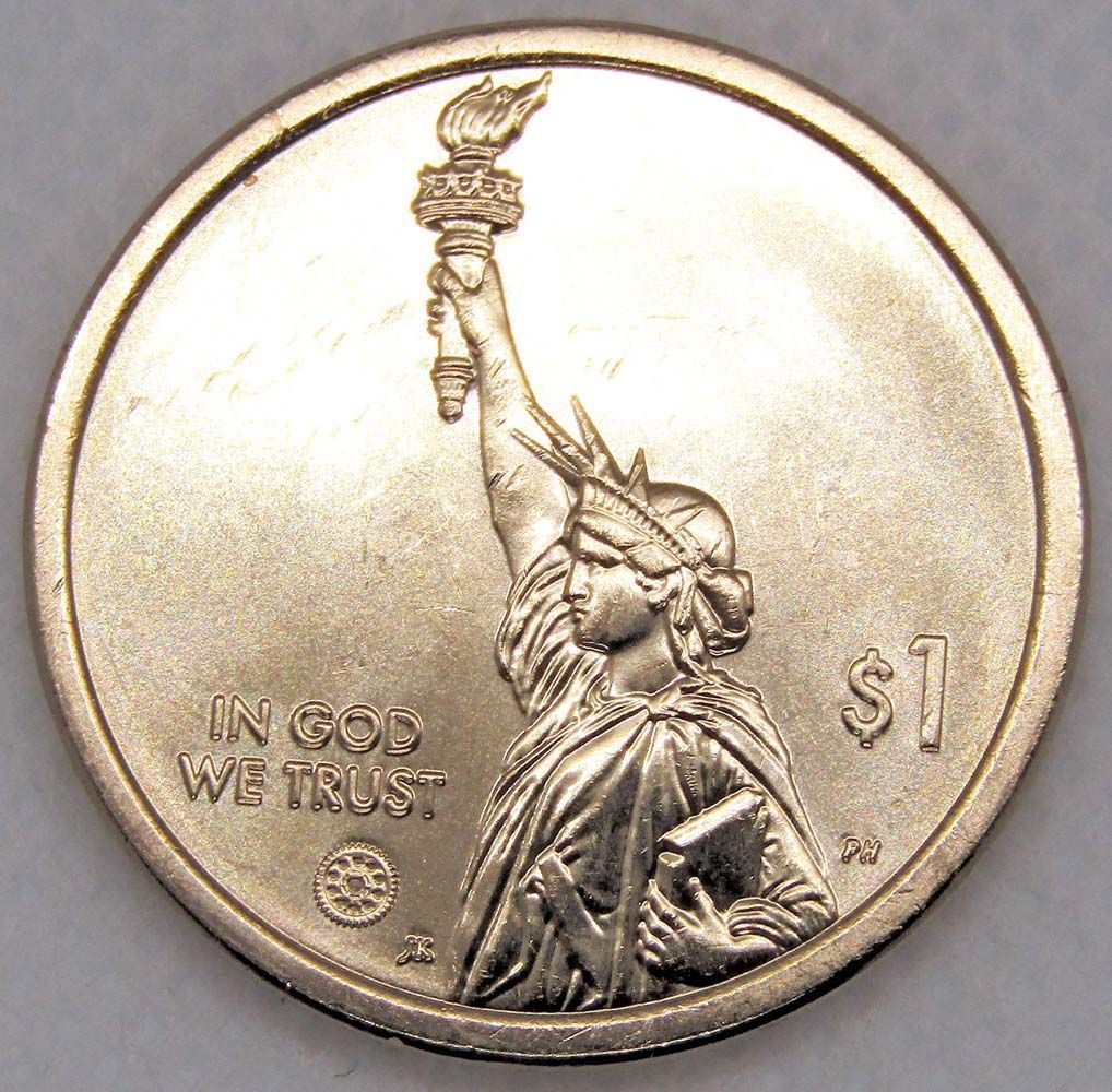Аверс: изображение Статуи Свободы в профиль с надписями «IN GOD WE TRUST» и «1 доллар».