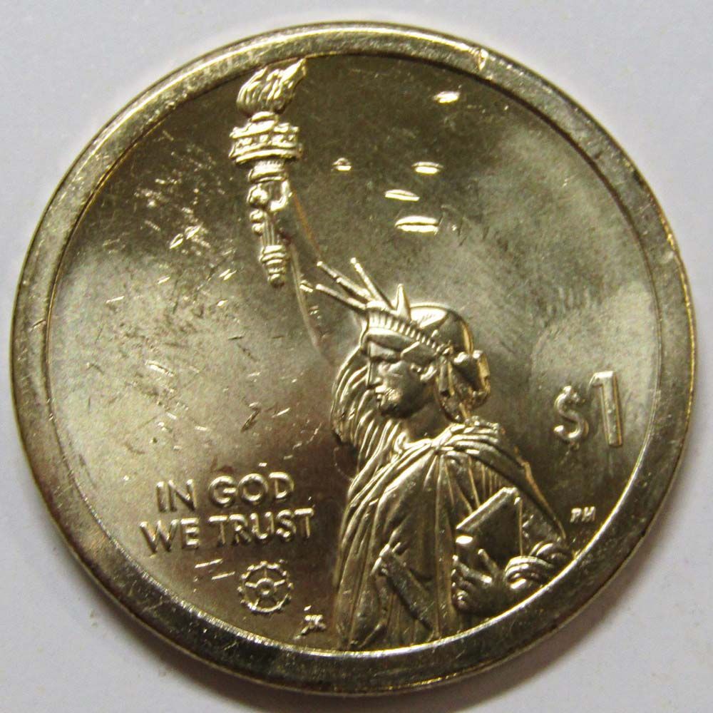 Аверс: изображение Статуи Свободы в профиль с надписями «IN GOD WE TRUST» и «1 доллар».
