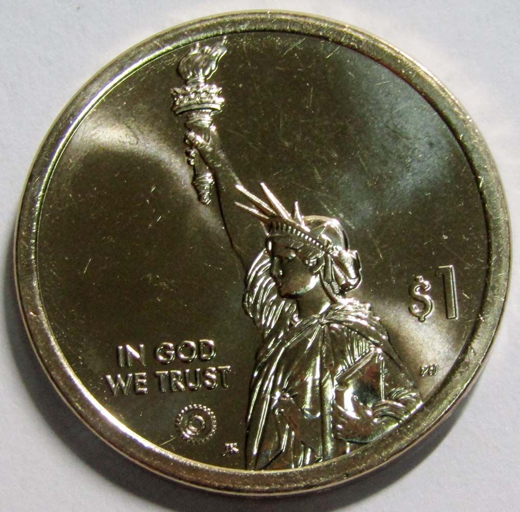 Аверс: изображение Статуи Свободы в профиль с надписями «IN GOD WE TRUST» и «1 доллар».